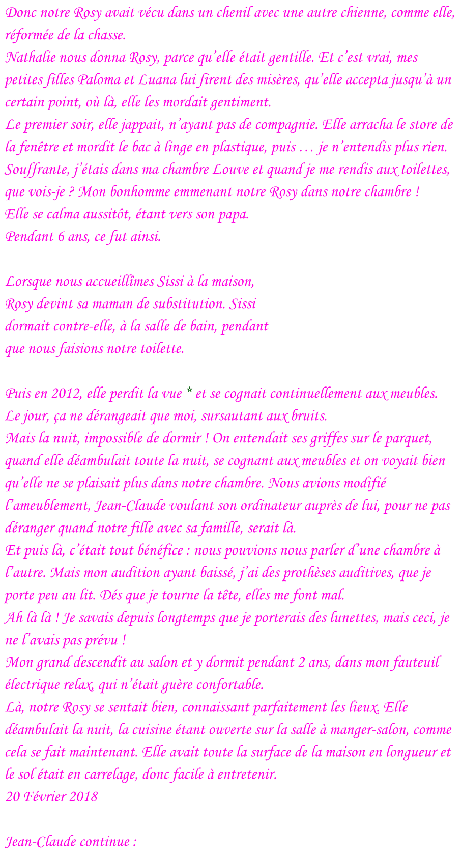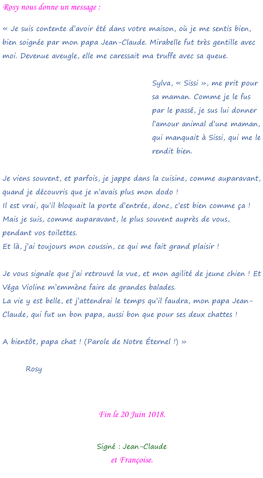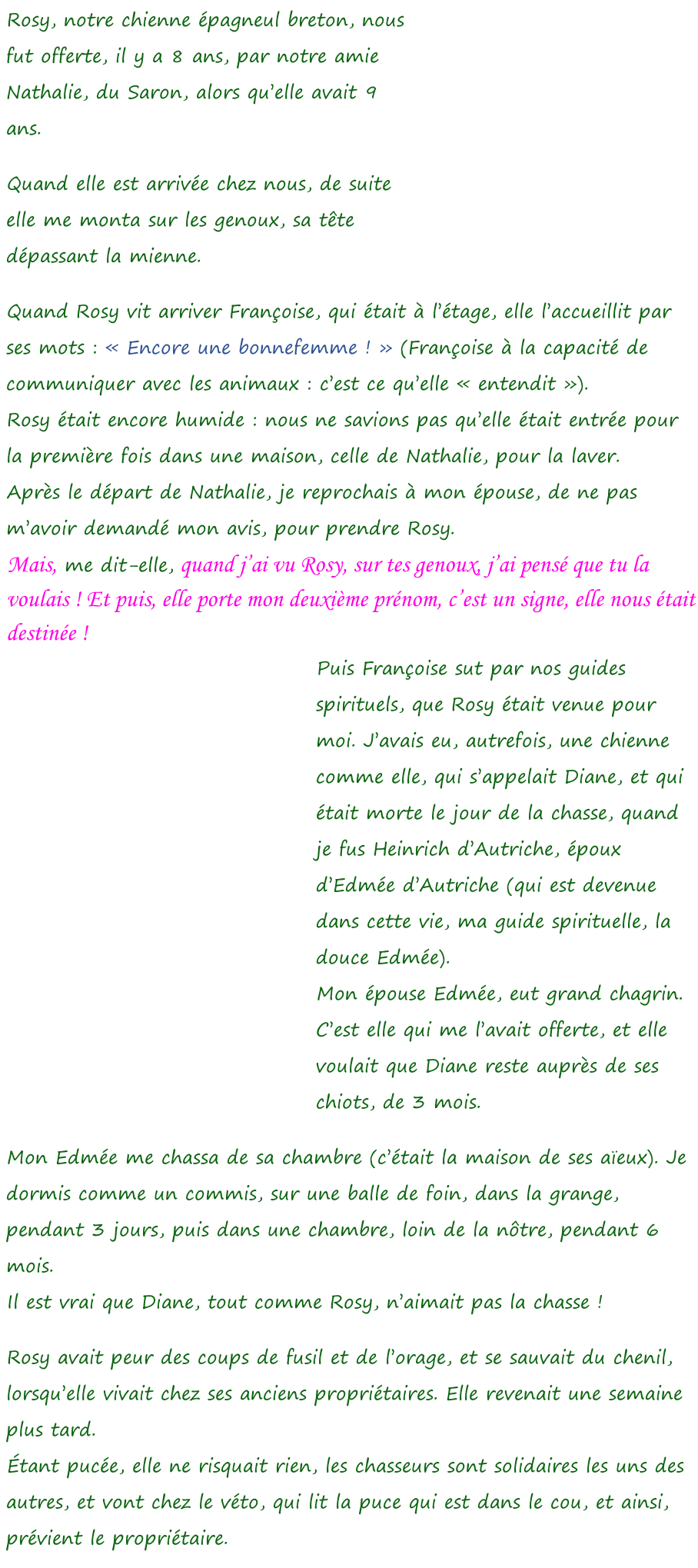 Rosy n’est plus ! Diane, offerte à Heinrich  d’Autriche, par son épouse, Edmée d’Autriche. De l’amour pour les animaux  Il est heureux de voir que certains terriens ont le cœur assez grand pour s’occuper des animaux, et d’en prendre soin ! Rolande, Rosy, Jean-Claude et Françoise. Signé : l’Éternel Yahvé Votre Dieu, <<< Retour à la page « Jean-Claude » Messages canalisés  par Françoise-Rose,  du 20 Février  au 27 Septembre 2018.