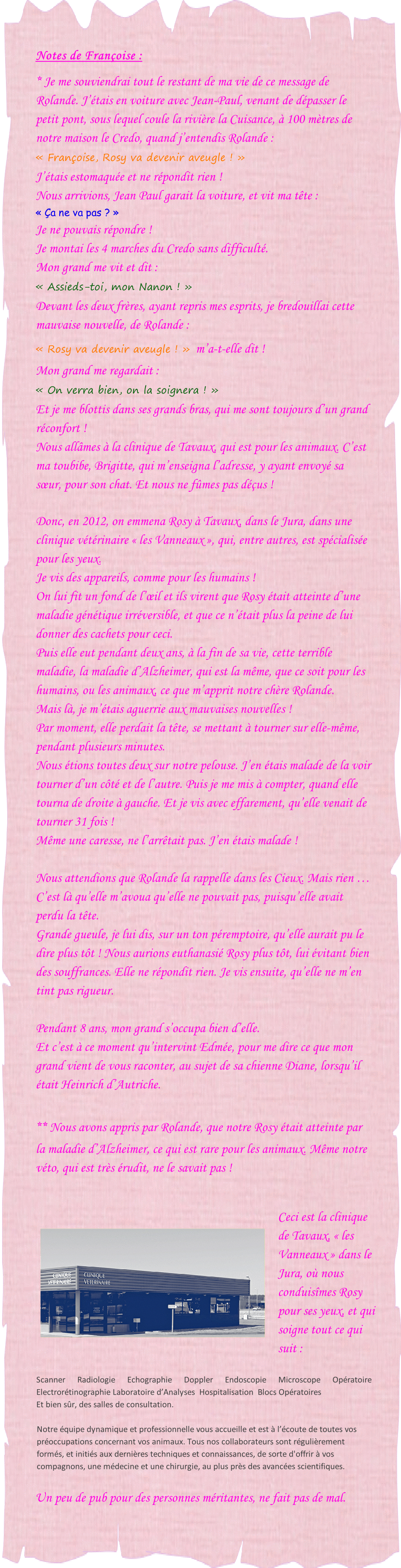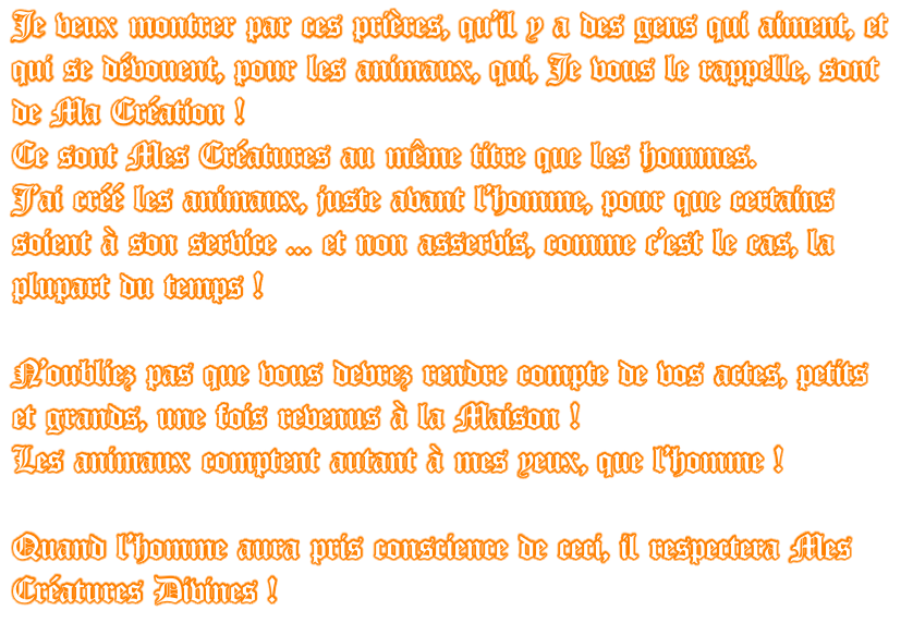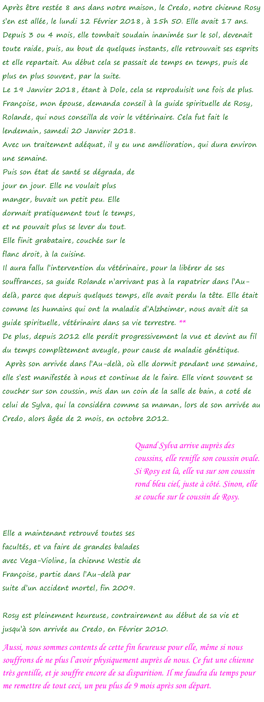 Rosy n’est plus ! Diane, offerte à Heinrich  d’Autriche, par son épouse, Edmée d’Autriche. De l’amour pour les animaux  Il est heureux de voir que certains terriens ont le cœur assez grand pour s’occuper des animaux, et d’en prendre soin ! Rolande, Rosy, Jean-Claude et Françoise. Signé : l’Éternel Yahvé Votre Dieu, <<< Retour à la page « Jean-Claude » Messages canalisés  par Françoise-Rose,  du 20 Février  au 27 Septembre 2018.