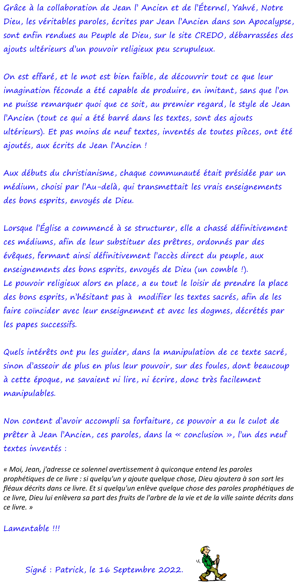 Commentaires sur l’Apocalypse de Jean l’Ancien <<< Retour à la page « Patrick »